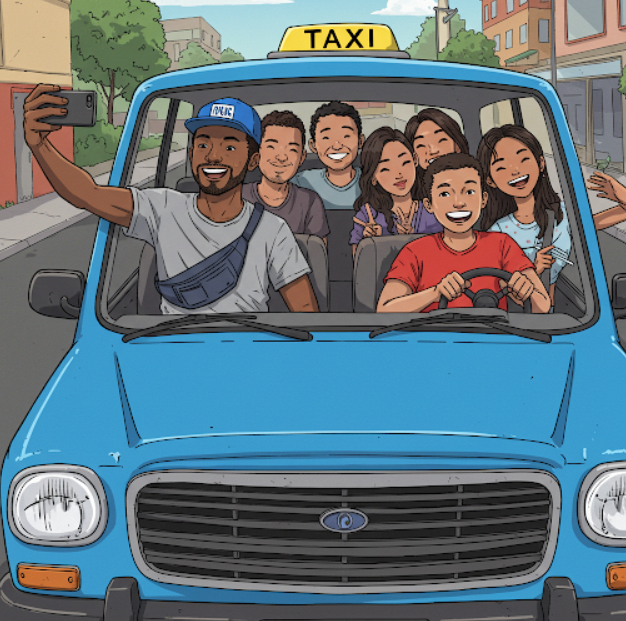 We’re in the taxi now. Our friend is so happy. He’s just got a week’s worth of income. He’s calling his wife, taking selfies with us, and showing us pictures of his kids. The guy is over the moon.